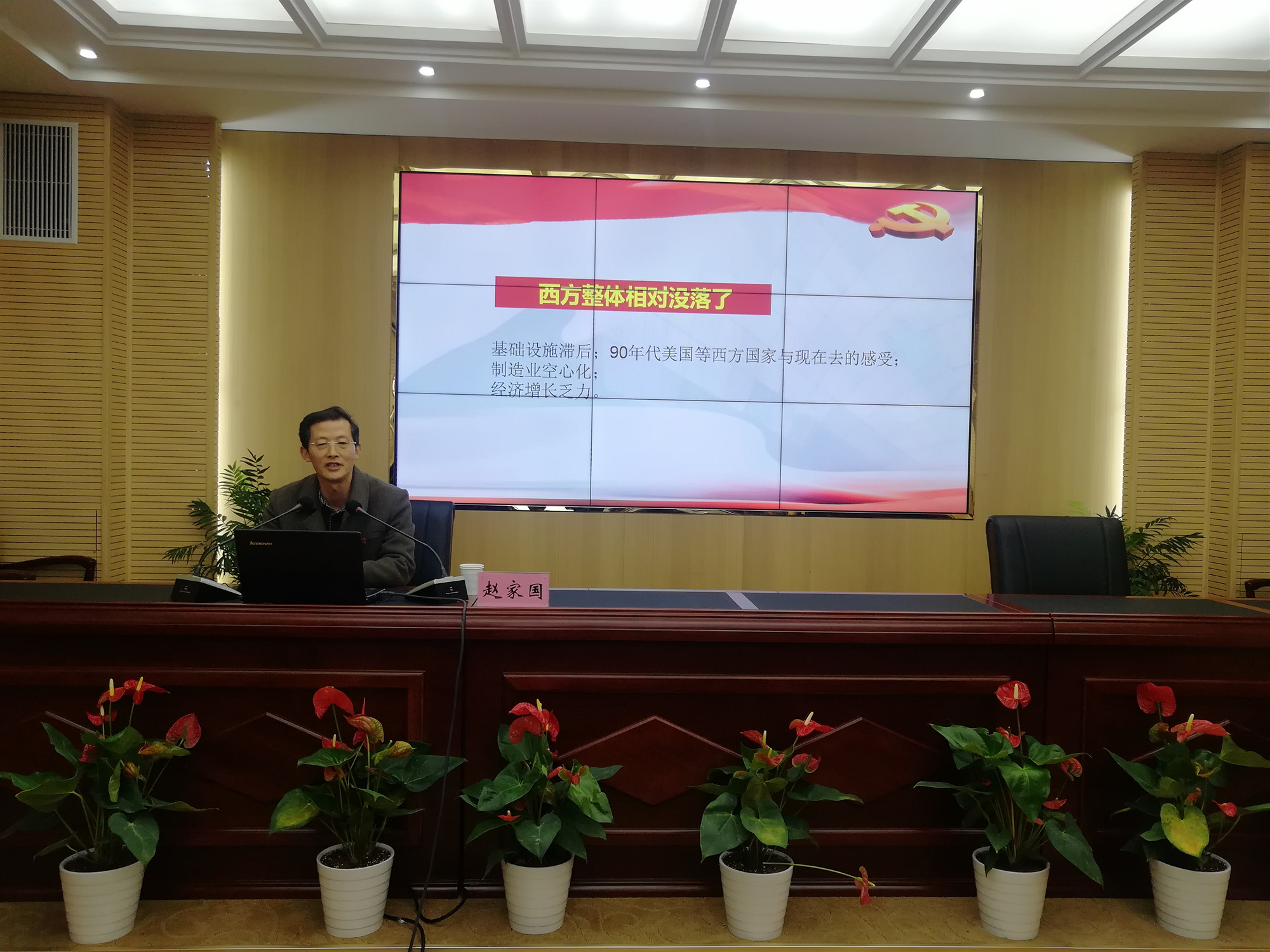 接著,趙家國教授以“12345”為提綱挈領(lǐng),結(jié)合國內(nèi)國外形勢,為大家詳細(xì)解讀了黨的十九屆五中全會精神的精髓和要義。“1”是一個重大判斷揭示未來發(fā)展環(huán)境異常復(fù)雜:《建議》提出當(dāng)前和今后一個時期,我國發(fā)展仍然處于重要戰(zhàn)略機(jī)遇期,但機(jī)遇和挑戰(zhàn)都有新的發(fā)展變化?!?”是兩個全局了然于胸謀劃未來:《 建議》指出全黨要統(tǒng)籌中華民族偉大復(fù)興戰(zhàn)略全局和世界百年未有之大變局,深刻認(rèn)識我國社會主要矛盾變化帶來的新特征新要求....。我們從這兩個大局出發(fā)來制定規(guī)劃?!?”是三個“新”揭示新征程無比豪邁:新階段、新發(fā)展理念、新發(fā)展格局?!?”是四個首次展現(xiàn)復(fù)興圖強(qiáng)雄心壯志:堅持創(chuàng)新在我國現(xiàn)代化建設(shè)全局中的核心地位,首次把全體人民共同富裕取得更為明顯的實質(zhì)進(jìn)展作為遠(yuǎn)景目標(biāo)提出,首次明確了建成文化強(qiáng)國的具體時間表,明確提出到2035年建成文化大國,首次提出確保二〇二七年實現(xiàn)建軍百年奮斗目標(biāo)?!?”是五大原則體現(xiàn)黨的領(lǐng)導(dǎo)更加成熟高超:堅持黨的全面領(lǐng)導(dǎo),堅持以人民為中心,堅持新發(fā)展理念,堅持深化改革開放,堅持系統(tǒng)觀念。